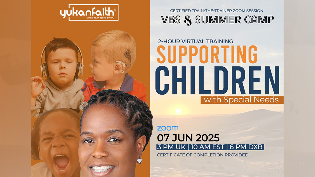 This 2-hour certified Zoom training equips church leaders, teachers, and volunteers with practical strategies to include children with special needs—such as autism, ADHD, and learning delays—into existing VBS and summer camp programs. Zoom: June 07, 2025 | Saturdays, 03 PM UK | 10 AM EST | 06 PM DXB